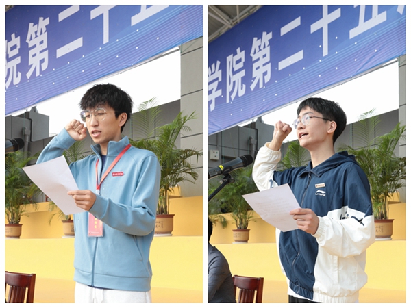 裁判员代表、体育学院教师李雪剑,运动员代表、生科院学生朱礼显分别郑重宣誓。