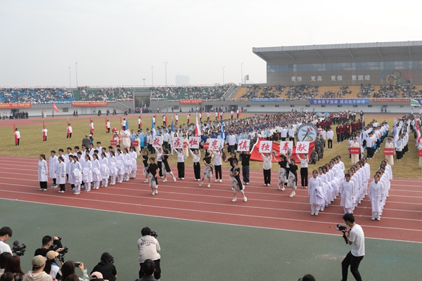 伴随着雄壮的《运动员进行曲》,国旗护卫队、校运动会会徽队以及全体裁判员、运动员迈着整齐的步伐,精神饱满地步入运动场。各代表队的方阵依次走过主席台前,向师生们展现着青春风采。