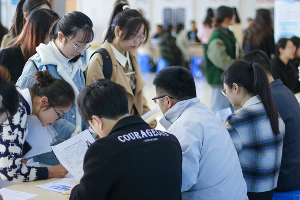 报名现场,学生根据自己的就业意向和前期系统报名情况,向各学校招聘负责人递交报名材料,介绍自己的学习实践经历、学术成果。同学们主动与招聘单位沟通交流,认真了解考核流程、招聘需求、岗位要求,主动进行微课讲授,积极争取就业岗位。招聘会现场气氛热烈、井然有序。在完成报名资格审核后,教育局现场发放面谈通知书,并于当天下午在东校区32幢教学楼分9组进行面谈,择优选择笔试对象154人。